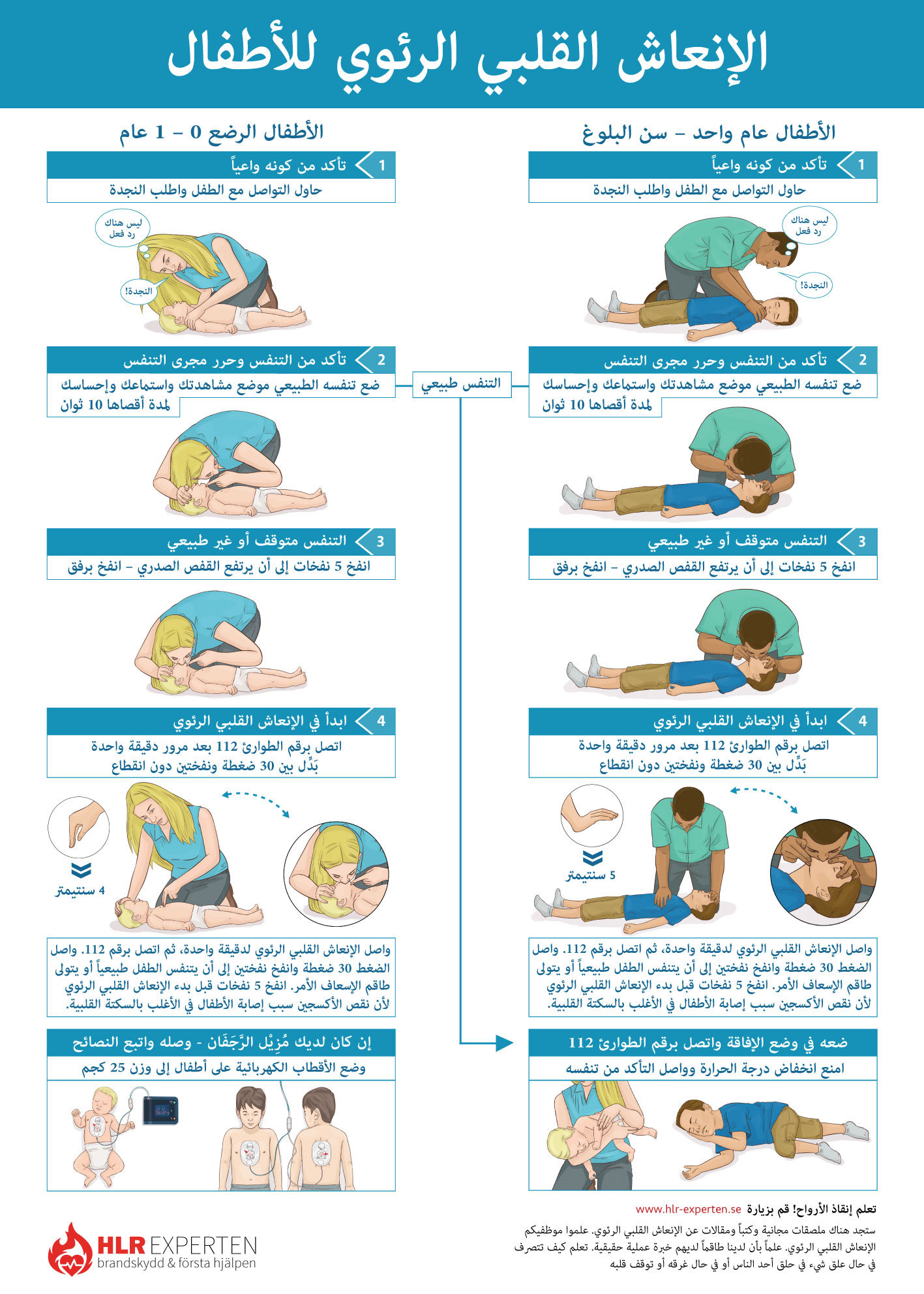 Download our arabic CPR posters totally free of charge. You will how to perform CPR on both adults and children and how to act if somebody chokes or drowns. These arabic CPR Posters are based on the latest CPR guidelines from the ERC. These arabic CPR Posters are translated by a certified translator in arabic and are produced by emergency personel with real life experience in CPR and first aid.